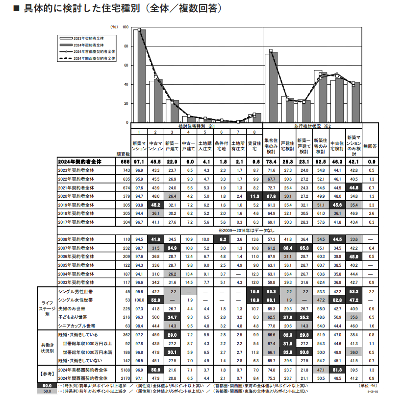 新築マンション購入者の半数近くが、「中古マンション」も並行検討しています。「中古マンション」を並行検討する人は、徐々に増えてきた様子が見られます。