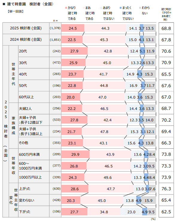 検討者(全国)のうち、今が建て時だと思っている人(建て時・計)は68.8%で、前年と同程度となっています。