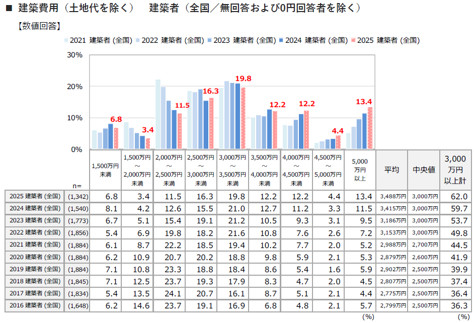 建築者(全国)がセミオーダーで建てた割合は20.7%、平屋建てを選んだ割合は年々増加し、2025年は25.3%という結果となりました。