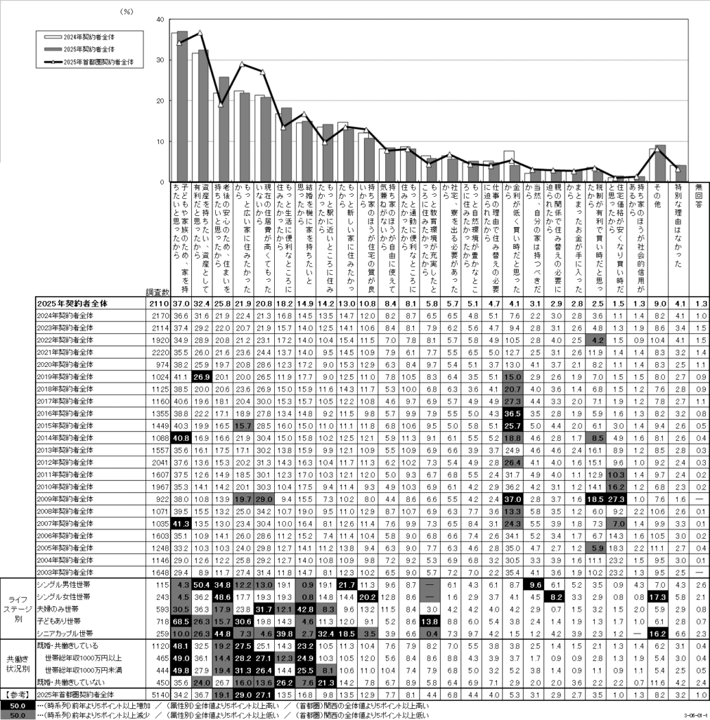 首都圏とは異なり、「資産を持ちたい、資産として有利だと思ったから」という理由は第二位ですが、2003年の9%から徐々に増えて2025年は32%となり、これまでで最も多くなりました。