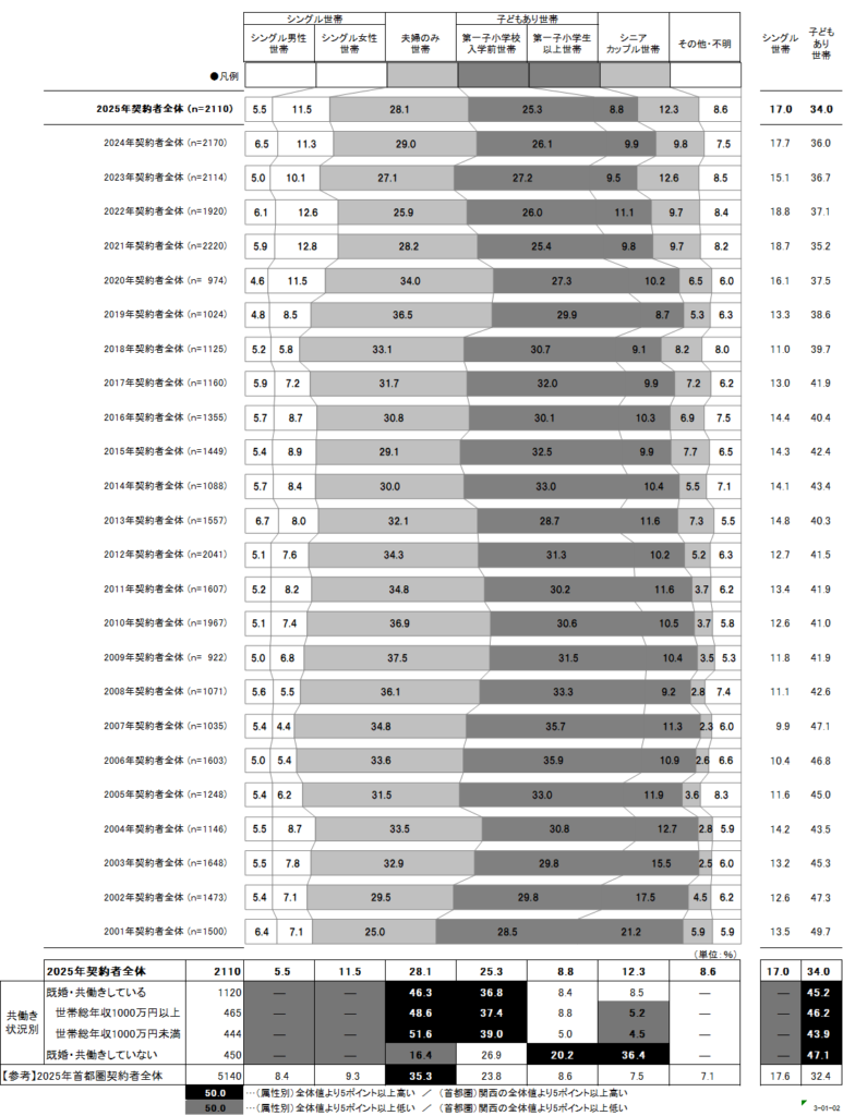 「子どもあり世帯」の割合は、2001年の50%から徐々に減少し、「シングル世帯」や「シニアカップル世帯」の購入者が増えています。