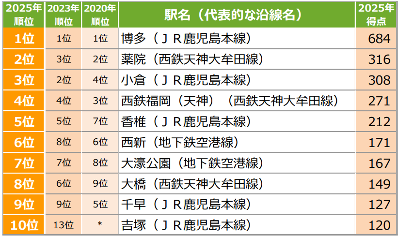1位は2020・2023年と同じく「博多」。2位は得点が22ポイント上昇した「薬院」、3位が「小倉」となった。