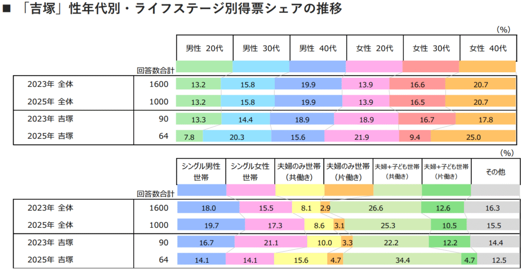 「吉塚」のライフステージ別得票シェアでは、「夫婦+子ども世帯(共働き)」の層から34.4%の支持を得ており、2023年の調査と比べてシェア率が10ポイント以上伸びている。これは、博多駅からわずか1駅という高い利便性を持ちながら、福岡市内で供給されるマンションとしては価格に割安感があり、コストパフォーマンスやタイムパフォーマンスを重視する子育て世代の支持が高まったと考えられる。