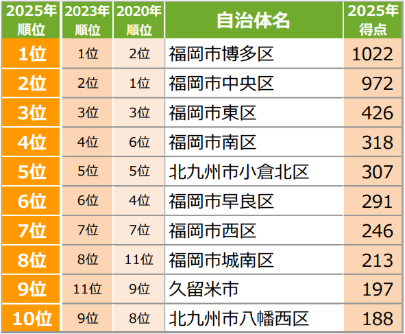 1位「福岡市博多区」から8位「福岡市城南区」までが前回調査の2023年と同じ結果となった。