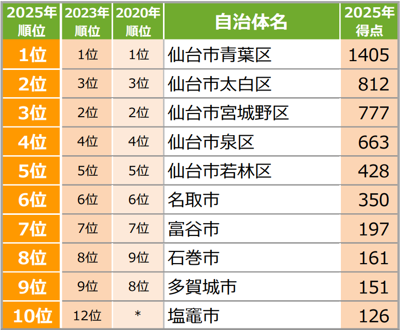 1位は「仙台」。以下、4位「名取」までが2020・2023年と同じ順位となった。