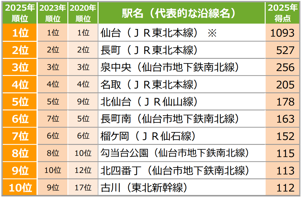 宮城県全体と仙台市ともに1位は「仙台」駅、2位が「長町」駅