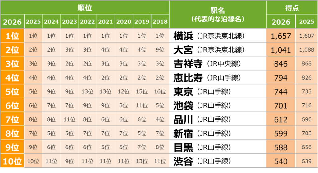 総合1位は9年連続で「横浜」。以下、2位「大宮」3位「吉祥寺」4位「恵比寿」と、上位4位までが2024・2025年と同じ結果となった。7位「品川」は昨年より1ランク順位が上昇した。